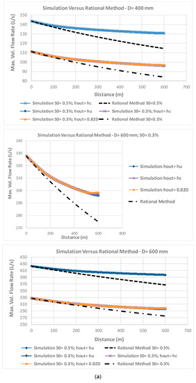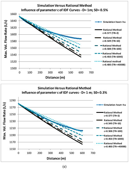 To analyze the influence of the exponent c of the IDF curves on the increase of the peak flow along the sewer with the rational method, limiting values of 0.450 and 0.400 were tested for a sewer diameter of 1 m and minimum slopes of 0.5 and 0.3%. In order to realize the magnitude of these values of c for the Portuguese territory, an extrapolation using a logarithmic regression was performed for the return periods established in Reference [21], and the estimation gave return periods of the order of more than 1000 years and about 40,000 years, or more, respectively. The comparison of the different peak flows reached is presented in Figure 3c. This figure shows that, with the exception of the extreme values of c = 0.400 and S0 = 0.3%, the simulation curve (with the normal depth as the downstream boundary condition) is always clearly above the curves of maximum flows obtained by the rational method.