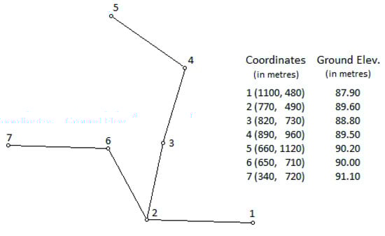 For comparison between the peak flows obtained in the simulation and those calculated with the rational method, a dendritic network resulting from the three-dimensional optimization of a formulated urban drainage system was selected, tested, and presented in the first author’s doctoral dissertation, completed in 1996 [22]. Starting from the same simplified geometry, represented schematically in Figure 4, and the remaining data, an extensive and thorough analysis has now been developed and is presented in this paper. The figure nodes symbolize fixed position manholes that define the links of the separate stormwater networks. Influences on the simulated flows of aligned intermediate manholes (not represented) that are selected in the optimization and that do not receive lateral inflow are ignored. Table 2 presents the data related to sewers, namely the length, diameter, and slope; the information related to the sub-catchment areas (partial drainage basins) in each node, namely the time of concentration estimated for each surface basin, and useful areas, C × Ad; the entrance surface hydrographs in each node; the base flow of each entrance surface hydrograph considered in the simulations; and the maximum flow and the maximum velocity obtained according to the rational method in each upstream node of the link, calculated for the time of concentration reached in the respective section. The entrance hydrographs are assumed by simplification to be triangular, when Tp ≤ Tc (Figure 2a,b), or trapezoidal, when Tp > Tc (Figure 2c), for different tested precipitation.