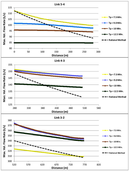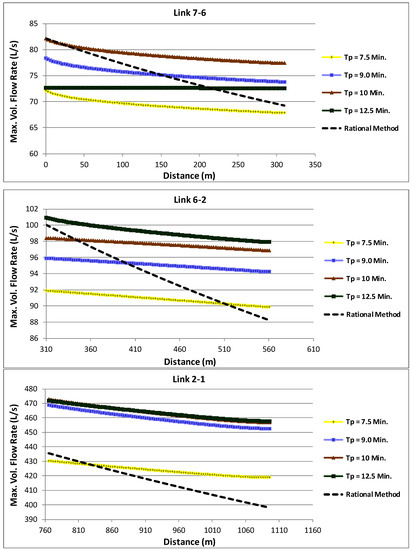 may be estimated by , where Lx is the distance between the two sections and U is the average velocity for the maximum computed flow. As a basic approximation just for this specific calculation, this maximum average velocity may be assumed as approximately constant along the considered length and equal to the one that occurs in the upstream extremity of the link [31]. This procedure is typically used, avoiding an iterative process for the time of transportation, rainfall intensity, peak flow, and average velocity, and is comparatively/theoretically on the safety side in the classic rational method. In fact, this approximation produces a faster response and a larger peak flow computed than the one calculated with the iterative method mentioned and is regarded here as an upper limit for the performed comparison. If Manning equation is used, Equation (14) then gives: