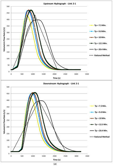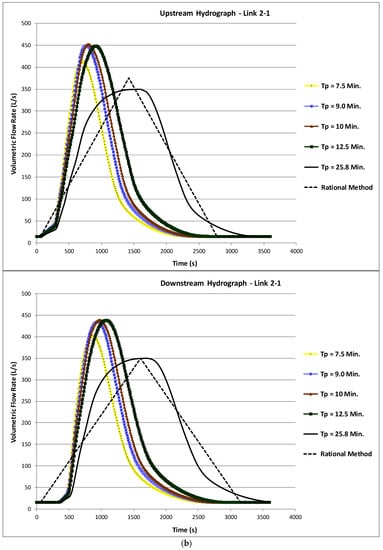 Durations of 7.5, 9.0, 10.0, 12.5, and 20.4 min, respectively. It should be noted that 20.4 min is the time of concentration in the downstream extremity of the network using the rational method. For the purpose of the comparison performed, when Tp < Tc, the inlet peak flow was assumed to be a fraction Tp/Tc of the maximum surface flow for the same intensity, reached at Tp, and with a hydrograph duration given by Tp + Tc (inferior limit condition for the peak flow and for the total volume of direct runoff).