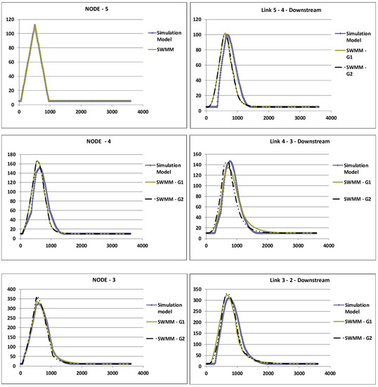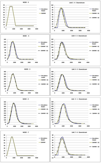 The hydrographs obtained in the nodes and in the downstream extremities of the links; the peak flows reached in the nodes for the dendritic network described and simulated in Section 3, with known simplified entrance surface hydrographs, using the implemented hydrodynamic model, with each link calculated separately and sequentially; and the US EPA SWMM model, version 5.1, applied for the network as a whole for the same entrance hydrographs, are represented and compared in Figure 7 and Table 3. The base criteria and data of sewers, partial drainage basins, and entrance hydrographs presented in Table 2 were maintained, and two precipitations of duration of 7.5 and 12.5 min were considered in the comparison. Two network geometries that differ only in the alignment of conduits were considered in the SWMM simulations: in SWMM–G1, conduits are aligned by the internal crown (the most frequent design criterion used); and in the second geometry, SWMM–G2, the alignment is performed through the sewer invert elevations. Both profiles, with the lengths, sewer slopes, and diameters of Table 2, begin with invert elevations of 88.765 m and 89.77 m, respectively at the extremity nodes 5 and 7. A free discharge was assumed in the end node 1 at the downstream network extremity in all SWMM simulations.
