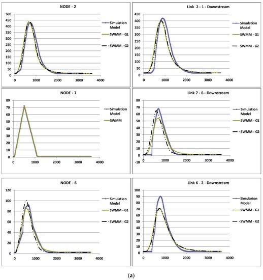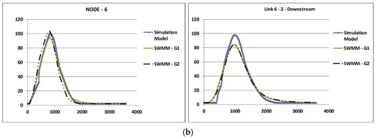The hydrographs in Figure 7a,b (which differ with regard to the time of precipitation) show both similar behaviors between the implicit simulation model and the explicit SWMM model for the network considered as a whole and that the maximum flows reached are in general relatively close (see also Table 3). The biggest differences found are reached in link 6-2 and seem to be mainly related to the SWMM results due to the fall that occurs at the confluence in junction 2. However, all differences reached are generally lower than 10%, and in the SWMM model, the reduction in the maximum flows is bigger when the sewers are aligned by the sewer crown than when they are aligned by the sewer invert (and the falls are minimized).