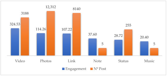 These results are in line with those found by Cvijikj and Michahelles [], who show that images are the most appealing format for achieving online engagement, and more specifically, for attaining a greater number of likes and shares. Using this format, WNGOs obtain on average, a level of engagement of 114.26 (see Figure 1). However, this value is relatively low compared to that obtained by the posts published in video format, almost tripling the level of engagement achieved (324.53). This is relevant and should be taken into account by WNGOs, since the video format also increases the level of information richness in social media organizations, which also leads to better outcomes of engagement []. Thus, the WNGOs should consider increasing the number of posts with video format since in the analyzed period, they published only 13.33% of their posts in this format.