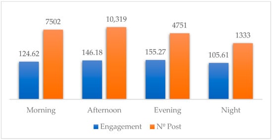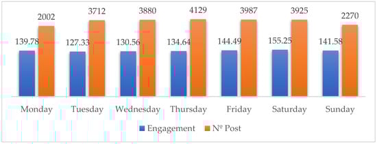 It is also relevant to note that Thursday exhibits the highest number of posts, followed very closely by Friday. In contrast, Monday and Sunday are the two days of the week in which the WNGOs publish the least number of posts (see Figure 2). In line with Mariani et al. [] the publication activities of WNGOs are concentrated prior to the weekend, although stakeholders interact more with the publications made on Saturday. Given this, WNGOs should consider issuing a greater number of messages during the weekend.