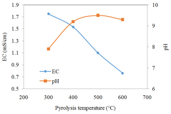 The EC decreased from 1.75 mS/cm to 0.76 mS/cm when the pyrolysis temperature increased from 300 °C to 600 °C presumably due to the decrease of soluble ions and more mineral formation (Figure 1). The pH of the biochar suspensions increased from 7.4 to 10.1 when the pyrolysis temperature was increased from 300 °C to 600 °C, because increasing pyrolysis temperature can promote the formation of biochar containing alkaline minerals and produce lower amounts of acidic functional groups (e.g., carboxylic groups) as evidenced by FTIR spectra (Figure 2) [21].