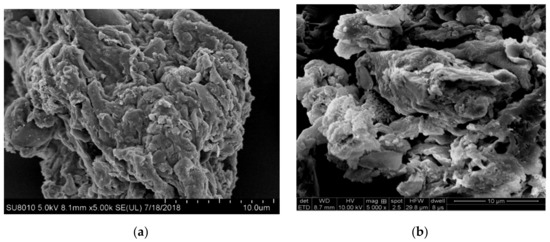 As shown in Figure 2a,b, the micromorphological structure of biochars was strongly affected by the pyrolysis temperature. MSB300 appeared as a rough and compact surface containing very few pores, while MSB500 appeared as a loose and porous structure. The specific surface area and pore volume of the biochars pyrolyzed at high temperatures were accordingly relatively large (Table 1). With the pyrolysis temperature increasing from 300 to 600 °C, the specific surface area increased from 10.3 m2/g to 31.1 m2/g, and the pore volume increased from 0.034 cm3/g to 0.062 cm3/g. The increase in specific surface area is mainly due to the destruction of organic functional groups and the formation of micro-pores in the biochars at high temperature pyrolysis.