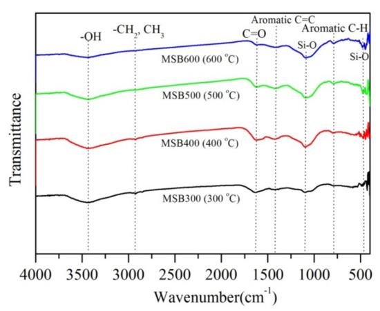 FTIR spectra of MSB pyrolyzed at 300 to 600 °C.