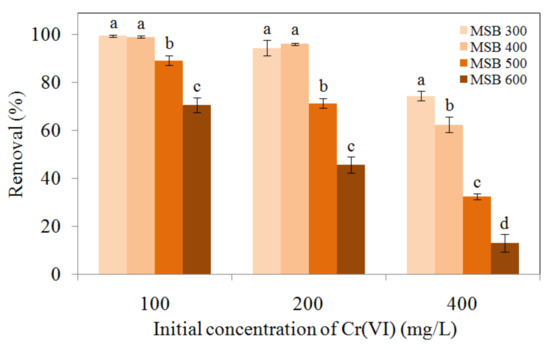 Comparisons of Cr(VI) 100, 200, and 400 mg/L removal by MSB from different pyrolytic temperatures at pH 2.0. The error bars marked with different letters (a, b, c, and d) indicate significant differences (p < 0.05).