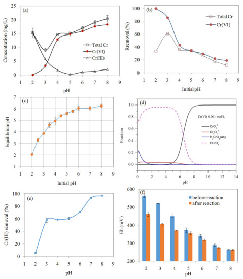 The effect of pH on the concentrations of Cr(VI), Cr(III), and total Cr is shown in Figure 5a, demonstrating that solution pH was an important factor affecting Cr(VI) removal. The percentage removal of Cr(VI) by MSB300 rapidly decreased with pH increasing from 2.0 to 8.0, with maximum removal efficiency (>99.9%) observed at pH 2 and minimum (18.9%) at pH 8 (Figure 5b). For example, the Cr(VI) concentration was below the detection limit (0.004 mg/L) for the initial Cr(VI) concentration of 25 mg/L by MSB300 (4 g/L) at pH 2. Meanwhile, the concentration of Cr(III) increased as a result of the Cr(VI) reduction (Figure 5a). It indicated that it would be favorable for Cr(VI) reduction into Cr(III) by the biochars at acidic solution, leading to the high pH-dependency of Cr(VI) removal. The effect of pH on only Cr(III) removal by MSB300 (Cr(III) 25 mg/L) is shown in Figure 5e. The removal of Cr(III) increased from 5.8% to 97.1% with pH increasing from 2.0 to 8.0. The pHpzc of silica in the biochar is about 2.0, so at low pH (~2.0), the silica surface (Si–OH) is negatively charged and can promote the adsorption of Cr(III). Cr(III) is mainly present as Cr3+ at pH 2.0 and carboxylic acid sites could be appreciably deprotonated to form chemical bonds with Cr3+. When the pH was increased, the dissociation of the acidic functional groups increased, which enhanced the complexation between Cr(III) and the anionic functional groups and thus increased the specific adsorption of Cr(III) [23]. The surface charge of the biochar and the distribution of Cr(VI) species are highly dependent on the pH of the aqueous solution. The main species of Cr(VI) in aqueous solution include CrO42−, Cr2O72−, HCrO4−, and H2CrO4. The distribution of Cr(VI) species as function of pH simulated by Visual MINTEQ 3.1 software (maintained by Jon Petter Gustafsson at KTH, Sweden) (available at http://hem.bredband.net/b108693/) is shown in Figure 5d. At low pH, the main species of Cr(VI) are HCrO4−, Cr2O72−, and H2CrO4, which can be reduced to Cr(III) by e− provided by the biochar surface groups (Equations (1)–(5)). The decrease in Cr(VI) removal with increasing pH could be caused by the electrostatic repulsion between Cr(VI) ions and negatively charged biochar surface [1,3,8]. The pH of solution increased after the reaction due to the consumption of H+ during the reduction of Cr(VI) and the release of alkaline materials in the biochars (Figure 5c) [2,10,12]. The redox potential (Eh) decreased after reaction mainly due to Cr(VI) reduction to Cr(III), especially at low pH (Figure 5f).