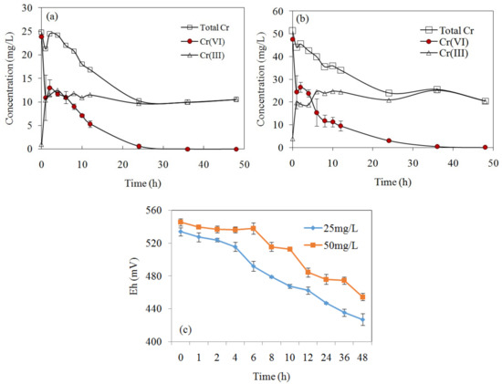 The concentrations variation of Cr(VI), Cr(III), and total Cr by MSB300 with initial concentration of Cr(VI) of 25 mg/L (a) and 50mg/L (b) at pH 2.0. The redox potential (Eh) variation during Cr(VI) removal by MSB300 (c).