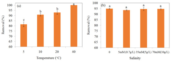 Effect of temperature on removal efficiency of Cr(VI) 100 mg/L by MSB300 (a), and effect of high salinity on removal efficiency of Cr(VI) 100 mg/L by MSB300 (b).
