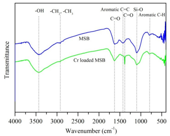 The FTIR spectra of MSB400 before and after Cr(VI) adsorption are shown in Figure 9. The vibrational intensity at 2923 cm−1, 1620 cm−1, and 1097 cm−1 decreased, and a peak at 1380 cm−1 (C=O stretch of carboxylate ions) appeared after adsorption. These changes indicated the involvement of aliphatic –CH2, CH3, C=O, and Si–O groups in chromium adsorption and the occurrence of surface complexation. The results are in line with previous studies, which showed many groups, including carboxyl, hydroxyl, –CH2, and CH3 groups, were responsible for Cr(VI) removal [1,2,13].