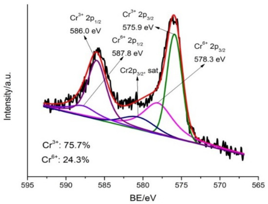 Furthermore, XPS analysis was performed to reveal the valence state of Cr bound on MSB300 after reaction with Cr(VI) at pH 2.0 (Figure 10). The peaks at binding energies of 586.0 eV (Cr 2p1/2) and 575.9 eV (Cr 2p3/2) can be assigned to Cr(III), and the peaks at 587.8 eV (Cr 2p1/2) and 578.3 eV (Cr 2p3/2) correspond to Cr(VI). The reduction of Cr(VI) to Cr(III) was confirmed according to XPS spectra analysis of the MSB300 surface where Cr(III) and Cr(VI) co-existed, with Cr(III) being the main (75.7%) species of adsorbed Cr for MSB300 after reaction with Cr(VI), respectively. The presence of Cr(III) was attributed to the reduction of Cr(VI) as described in Equations (1) to (4). Based on the mass balance analysis in combination with SEM-EDX, FTIR, and XPS data, Cr(VI) removal mechanisms from acidic aqueous solution by MSB300 could include three processes: (i) Cr(VI) adsorption by the positively charged biochar, (ii) Cr(VI) reduction to Cr(III) by electrons provided by biochar, and (iii) part of the converted Cr(III) complexation with functional groups and the rest released into the solution.