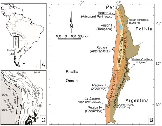 (A) Localization of the area of this study. (B) Morphostructural domains (shades of brown) and administrative regions (modified from []). In blue: Pampa de Tamarugal aquifer. (C) Morpho-tectonic units of the central Andes (modified from []). SBS: Santa Barbara System; SP: Sierras Pampeanas. The “Modern Forearc” coincides with the Precordillera and the Coastal Cordillera [].