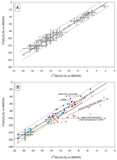 Finally, geothermal water samples from a recent study were plotted with the EIV regression line and the generalized interval, showing more clearly the distinction between the meteoric waters and the hydrothermal water samples that can be isotopically enriched as a result of high-temperature isotopic fractionations between water–rock, mixing with andesitic water or water–gas interactions [,] (Figure 2B). Specifically speaking, the Torta de Tocorpuri (TT in Figure 2B) and Pampa Lirima (PL in Figure 2B) samples are not different from meteoric waters. According to the Tassi et al. [], the limited temperature and involvement of the so-called “andesitic water” does not produce a relevant shift from the meteoric composition in these two sample groups (Figure 2B). In particular, the PL sample group lies precisely between Pampa del Tamarugal line and the EIV local meteoric water line (Figure 2B).