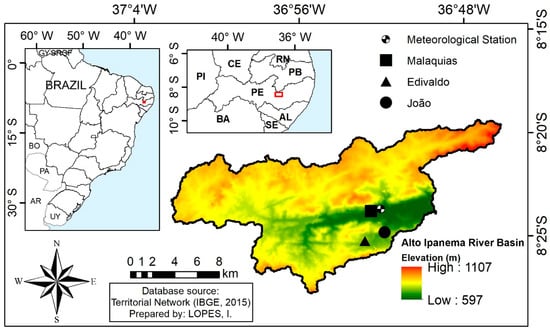 Location of the study sites of Malaquias, Edivaldo, and João in Alto Ipanema River Basin, Pernambuco State, Brazil.