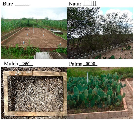 Figure 2 shows a general view of the investigated cover conditions (Bare, Natur, Mulch, and Palma): Bare—soil without any of natural or artificial cover on the plot; Natur—predominantly natural and/or spontaneous vegetation composed of small and medium-sized shallow caatinga, with predominant quince (Croton sonderianus) and jurema-preta (Mimosa hostilis Benth.); Mulch—dry grass mulch (Brachiaria decumbens) with a density of 8 t ha−1; Palm—presence of forage spineless Palma (Opuntia cochenillifera) planted in regular spacing of 0.5 × 1.5 m, forming a vegetation contour ridge.