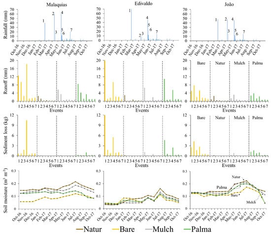 Time series of rainfall, runoff, sediment loss, and soil moisture during the study period. The cover condition identification was inserted in the charts of João, thus representing all the other sites.