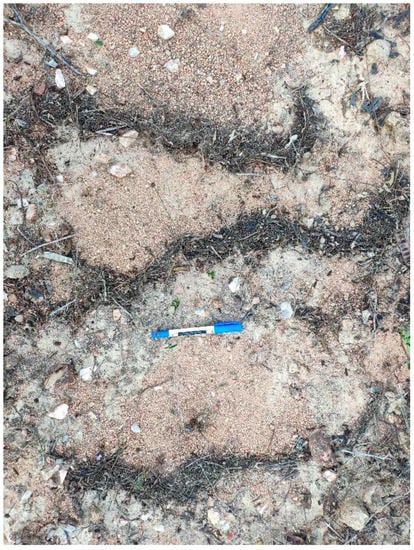 Runoff had different behavior, with natural cover generating the smallest runoff depth and bare soil conditions producing the highest runoff. Mulch reduced soil loss because small barriers of accumulated mulch material formed, approximately following the elevation contours. These barriers (Figure 5) promoted the deposition of soil particles upslope.