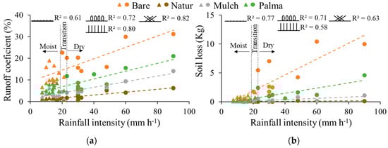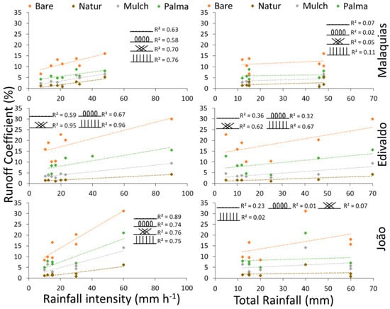 Figure 6 and Figure 7 verify the relationships between the runoff coefficient (defined as the ratio between runoff depth and total rainfall) and soil loss as a function of rainfall depth and intensity. Rainfall intensity explains better the observed variations in the runoff coefficient than rainfall depth. It was shown that mulching successfully protected the soil surface for all three sites, which allowed a higher infiltration rate and, thus, greater soil moisture storage. For Palma, a similar behavior was observed both for runoff and soil loss.