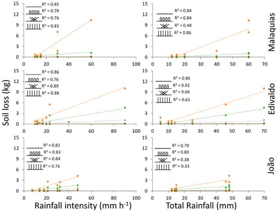 Runoff generation was strongly related to antecedent moisture conditions of a specific event, as observed in Figure 8a. Soil loss, however, was more correlated to rainfall intensity (Figure 8b). Characteristic rainfall temporal regimes in the Brazilian semi-arid region, where higher intensities were verified at the beginning of the event, were also observed.