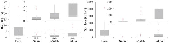 Figure 9 describes the basic statistics for runoff and soil loss by comparing the different surface covers. By far, the bare soil plots produced more total runoff and sediments. Mulch cover was close to natural vegetation cover, but still had a higher runoff and sediment loss. Palma presented an intermediate hydrologic response (see also Figure 6 and Figure 7).
