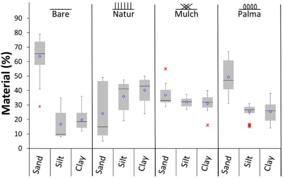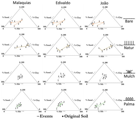 Sediment evolution, in terms of percent of clay, silt, and sand in our study, can be observed for the sequence of rainfall events in Figure 11. Lines show the behavior of the textural displacement in the United States Department of Agriculture (USDA) textural chart. According to Figure 11, there were common textural displacement patterns for each soil cover (Bare, Natur, Mulch, and Palma).