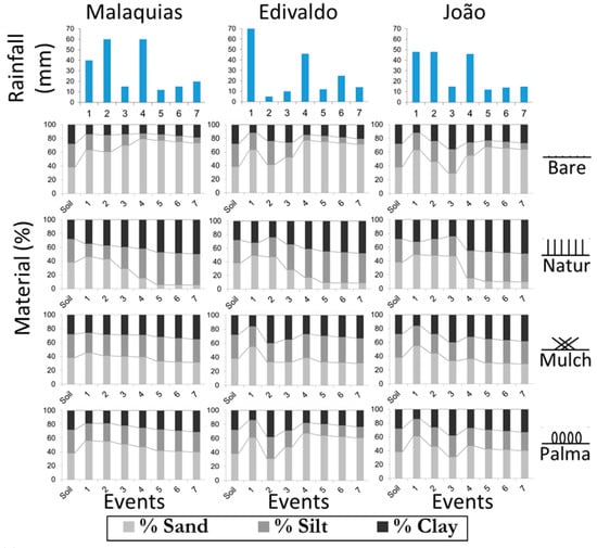 Tracking percentages of sand, silt, and clay for the three sites in all soil covers, together with the seven rainfall events that produced erosion in the plots.