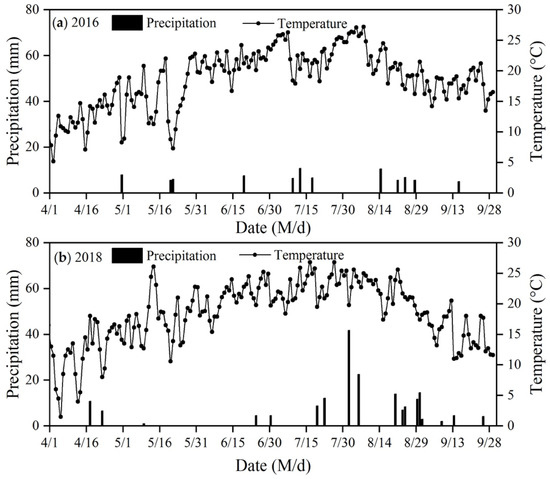 Daily precipitation and average air temperature during the growing season (a) in 2016 and (b) in 2018 at the Shiyang River Basin Experiment Station, Wuwei City, China.