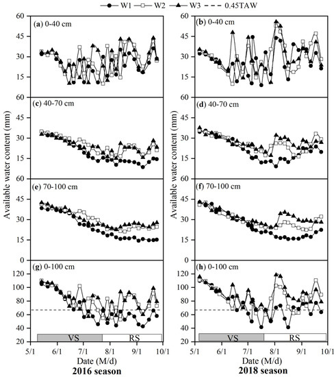 Available water content at soil layers of 0–40 cm (a,b), 40–70 cm (c,d), 70–100 cm (e,f) and 0–100 cm (g,h) for W1, W2 and W3 in 2016 (left panel) and 2018 (right panel). W1, W2 and W3 are the treatments with different Dh (designed wetting depth). Dh values in W1, W2 and W3 are 0–40 cm, 0–50 cm and 0–60 cm, respectively. Data points indicate average of three replications of one treatment at one point during growing season. VS and RS are vegetative stage and reproductive stage, respectively.