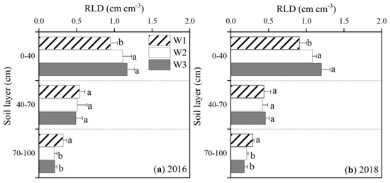 Root length density (RLD) for 0–40 cm, 40–70 cm and 70–100 cm soil layers (a) in 2016 and (b) in 2018. W1, W2 and W3 are the treatments with different Dh (designed wetting depth). Dh values in W1, W2 and W3 are 0–40 cm, 0–50 cm and 0–60 cm, respectively. Horizontal bars represent standard errors. Different letters above bar plot indicate that there are significant differences in RLD between means for a specified soil layer (P < 0.05).