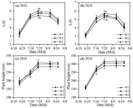 Temporal changes in leaf area index (LAI) (a,b) and plant height (c,d) due to W1, W2 and W3 (a,c) in 2016 and (b,d) in 2018. W1, W2 and W3 are the treatments with different Dh (designed wetting depth). Dh values in W1, W2 and W3 are 0–40 cm, 0–50 cm and 0–60 cm, respectively. Vertical bars represent standard errors. Different letters above bar plot indicate that there are significant differences in maximum LAI among treatments (P < 0.05).