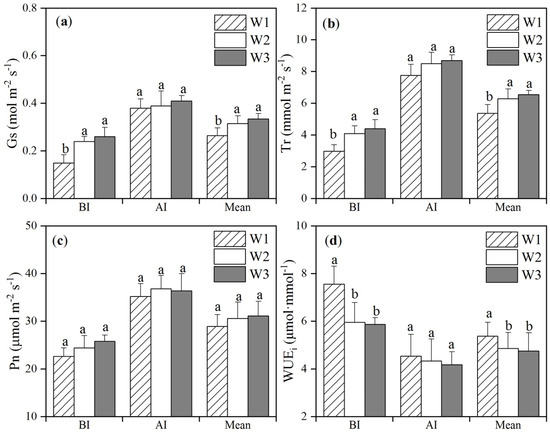 Stomatal conductance (Gs) (a), transpiration rate (Tr) (b), net photosynthesis rate (Pn) (c) and intrinsic water use efficiency (WUEi) (d) of spring maize before (BI) and after (AI) irrigation in 2016. Mean values indicate the average values from BI and AI. W1, W2 and W3 are the treatments with different Dh (designed wetting depth). Dh values in W1, W2 and W3 are 0–40 cm, 0–50 cm and 0–60 cm, respectively. Vertical bars represent standard errors. Different letters above bar plot indicate that there are significant differences in Pn/Tr/Gs among treatments at P < 0.05.