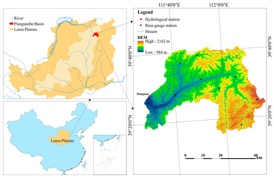 In this study, we selected the Pianguanhe River in the key soil erosion region of the Loess Plateau as our case study. The Pianguanhe River is located in the hilly and gully region of the Loess Plateau (111°26′ E–112°17′ E, 39°15′ N–39°42′ N) (Figure 1). It is a tributary of the Yellow River with a watershed area of 2089 km2, with altitude ranging from 984 to 2162 m. The study area features a semi-arid continental climate, with an average annual rainfall of 429 mm. The uneven seasonal distribution of precipitation results in more than 80.9% of the annual precipitation occurring from May to September []. The average annual runoff and sediment discharge is 39.48 million m3 and 12.58 million t, respectively. The sediment modulus is 65.23 t/ha/yr []. The overall loss of soil and water is a serious environmental issue.