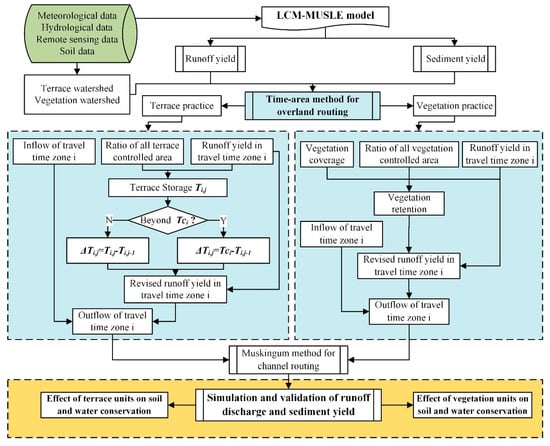 In this study, we added the impact of terrace and vegetation practice on runoff and sediment routing in the time-area method. The revised time-area method was integrated into the LCM-MUSLE model which is suitable to estimate the water and sediment yield in the Loess Plateau. Eight isolated storm events in the 1980s and 2010s in Pianguanhe Basin were selected to calibrate and verify the original LCM-MUSLE model and its revised version. It is shown that the original model was not applicable in the more recent years, since the surface had changed significantly as a result of revegetation and terrace engineering. The revised model considered the impact of vegetation and terracing on runoff and sediment routing and its accuracy had been improved significantly.