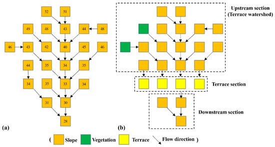 Schematic diagram of flow direction of (a) natural hillslope, and (b) the hillslope with vegetation and terrace practice. Numbers in the grid are elevations. Orange represents natural hillslope unit. Green represents vegetation unit. Yellow represents terrace unit. Arrows represent flow direction.
