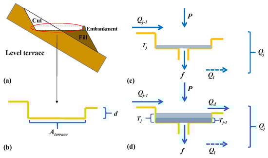 Schematic diagrams of the hydrological processes and flow distribution of the level terrace unit. (a) Section profile of a level terrace. (b) The generalization of the level terrace in (a). The flow distribution assumes that the soil profile of the terrace is deep enough for subsurface flow generation. The influence of the flow in different scenarios is listed from (c,d). Aterrace is the area of terrace; d is embankment height of terrace; P is rainfall; f is the infiltration; Ql is the interflow; Qj−1 is the inflow; Qd is the overflow; Tj is the water stored in the terrace at the present time step j; Tj−1 is the water stored in terrace at previous time j − 1; and Qj is the outflow.