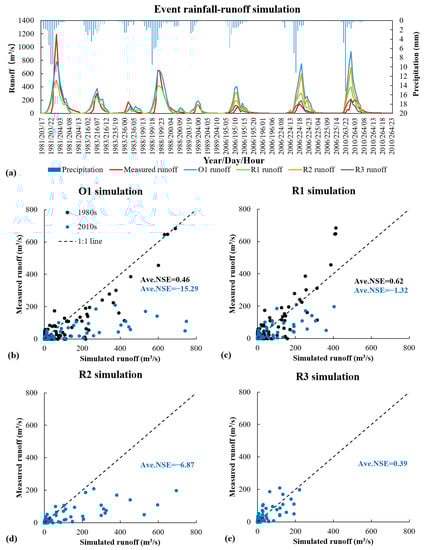 Comparison of the simulated runoff with the measured runoff is shown in Figure 7b–e. Figure 7b shows the validation of O1, in which the five events in the 1980s achieved an average NSE of 0.46, while the three events in the 2010s achieved an average NSE of −15.29. The data points of the 1980s are distributed close to the 1:1 line, while the data points of the 2010s are distributed farther away from the 1:1 line. It shows that the original model did not achieve good performance for recent years, since the surface had undergone significant change. Figure 7c shows that the average NSE of the 1980s and 2010s both increased in R1, with the average NSE of the 2010s showing a greater increase (value of −1.32), and the data points of the 2010s distributed closer to the 1:1 line than in the O1 validation shown in Figure 7b. Figure 7d shows the R2 validation, and indicates that the average NSE of the 2010s has also increased compared with that of O1, but that the extent of the increase is less than for R1. Figure 7e shows the R3 validation and indicates that the average NSE of the 2010s is 0.39, which for the first time is positive, and that the data points of the 2010s are closely distributed around the 1:1 line. Overall, the simulation accuracy of the 2010s is highest in R3, followed by R1. These figures show that the revised model was better at simulating the runoff in recent years and can reflect the effect of significant surface change (i.e., slope terracing and revegetation) on runoff.