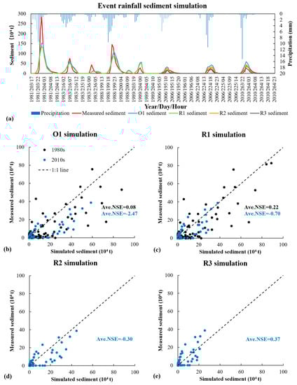 NSE was also used to evaluate the performance of the simulated sediment discharge, as shown in Figure 8b–e. Figure 8b shows the O1 validation, in which the five events in the 1980s achieved an average NSE of 0.08, while the three events in the 2010s achieved an average NSE of −2.47. It shows that the original model did not achieve good performance in the recent years. Figure 8c shows the R1 validation, in which the average NSE of the 1980s and 2010s both increased. The data points of the 1980s and 2010s were distributed closer to the 1:1 line than in Figure 8b. Figure 8d shows the R2 validation, in which the average NSE of the 2010s have also increased, and greater than that of R1, which indicates that terrace can significantly reduce sediment. Figure 8e shows the R3 validation, in which the average NSE of the 2010s is 0.37, and the data points of the 2010s are distributed closely around the 1:1 line. Overall, the accuracy of the simulation in the 2010s is highest in R3, followed by R2. These figures show that the revised model performs better in recent years, and can reflect the effect of significant surface change (i.e., slope terracing and revegetation) on sediment yield.