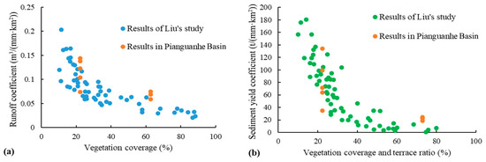 Comparison of runoff generation coefficient (a) and sediment yield coefficient (b) in this study and in Liu’s study.