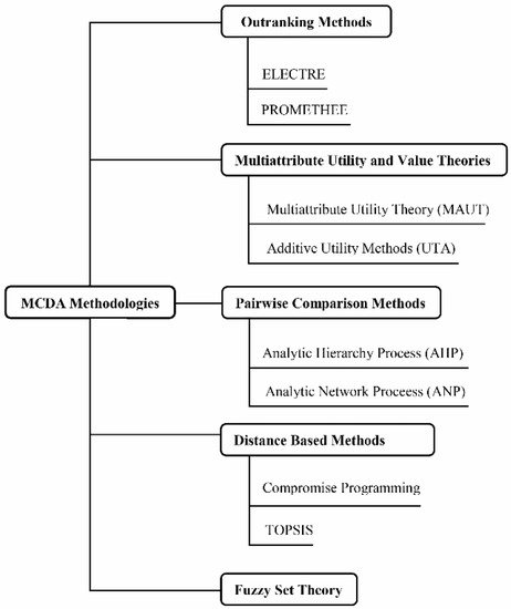 Several MCDA techniques are discussed in the literature. Figueira et al. [35] developed an exhaustive state of the art of this field, as presented in Figure 1. MCDA techniques can be classified in categories such as outranking methods, multi-attribute utility and value theories (MAUT and MAVT), pairwise comparison methods, distance based methods, and fuzzy set theory. MCDA methodologies and their implementation is a relevant research field, given its impact on improving the decision-making process in complex environments and problems. Numerous MCDA techniques provide decision makers and analysts the opportunity to properly and effectively address decision problems.