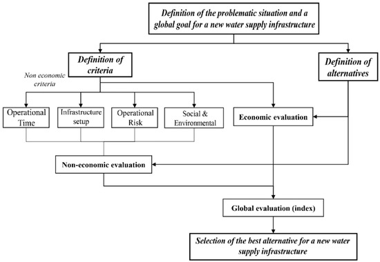 MCDA methods are powerful decision-making support tools for water infrastructure supply planning [31,32,37]. A MCDA methodology that treats economic criteria separately from non-economic criteria is proposed to address the water supply infrastructure planning problem. This structured methodology represents a new approach to address this type of decision-making problem. The use of four main non-economic criteria, which are adaptable to other possible applications, is proposed: operational time, infrastructure setup, operational risk, and socio-environmental. The selected economic criterion was the present value (PV) of the costs. A global evaluation that combines non-economic assessments and economic assessments was developed to analyze the tradeoff between benefits and net present of the costs.