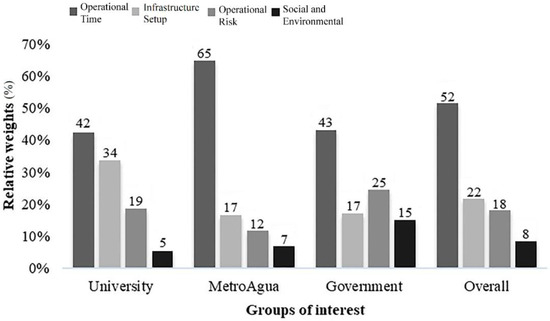 The eight experts completed an online survey; their judgments were pondered in their respective groups as the geometric average of the recorded values. Figure 3 shows each group’s preference regarding the main criteria of the decision problem. Although differences exist among the interest groups, operational time was consistently considered as the most important criterion. Infrastructure setup was the second most important criterion for all groups, with the exception of Government, which considered operational risk to be second in importance. A consensus was obtained for Social and Environmental as the least relevant criteria among the main criteria. The relative weights of the sub-criteria are presented in Figure 4. Note that the judgement of the experts was systematically consistent; thus, every evaluated matrix had a consistency ratio less than 0.1, and the total model a value of 0.01.