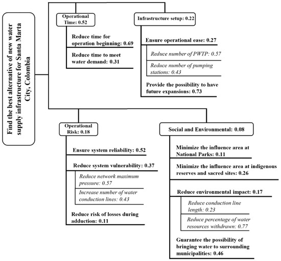 As the water supply infrastructure serves to satisfy several purposes and has different benefits and costs, the criteria against which the performance of the system is going to be assessed must be defined [44]. These criteria depend on the context of every particular situation. However, a common approach has been to consider social, technical, environmental, and economic aspects, such as the main criteria [39,41,45]. As suggested by Saaty [46], the analysis of the problems in this research will be separated into two main groups: non-economic criteria and economic criteria.