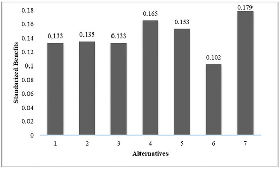 where is the value of the index for alternative ; is the weight given to the costs; is the normalized benefits; is the normalized costs for alternative , respectively; and is the set of alternatives. The range of the performance index will vary between −1 and 1.