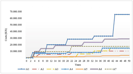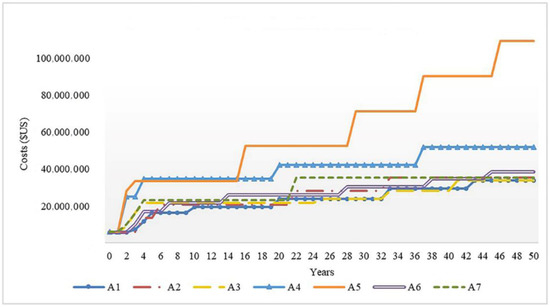 The estimated annual pumping and treatment costs constitute the main variable cost driver. These costs were estimated throughout a 50-year planning horizon and are presented in Figure 6 and Figure 7, respectively. Saldarriaga et al. [58] have estimated the construction costs for each alternative by considering the costs of excavation, pipelines, pumping stations, and new PWTPs. As shown in Table 4, the total costs of the alternatives have been valued as the sum of the discounted operative costs during the project lifespan and the associated constructive costs. In addition to the long lifespans of water supply infrastructure projects, the operative costs account for the majority of the total costs and represent the main difference among alternatives.