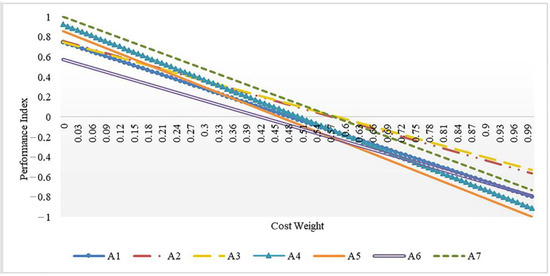 Figure 8 shows the performance index (PI) for each alternative when varying the weight given to the cost along its range. Given a certain cost weight, note that the alternative with the highest PI is the best among its group. The graph illustrates the sensitivity of the ranking to the variation of the cost weight: A7 remains the best alternative when the weight of the cost criterion is lower than 0.56. However, when the weight exceeds 0.56, A3 and A2 are superior,r due to their lower cost. A4 and A5 rank second and third on the benefits scale but are the most expensive; thus, when the weight given to the cost criterion exceeds 0.32 and 0.19, respectively, they are exceeded by A3 and A2, which are equal. A1 and A6, which have poor performance in benefits, improve in the ranking only because they are less expensive than A3 and A2.
