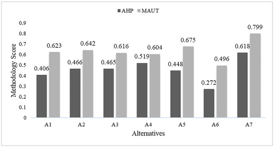 Alternatives’ scores by methodology (AHP and MAUT).