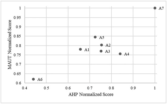 Figure 9 provides a comparison of the alternatives scores relative to the implemented methodology, namely, the AHP (performance index) and MAUT models. In general, the AHP score is lower than the score calculated by MAUT; however, similarities exist in the ranking obtained by both models. Table 6 shows the rankings obtained with the AHP and MAUT methods, where A7 is the best alternative, A2 ranks third, and A6 ranks last.
