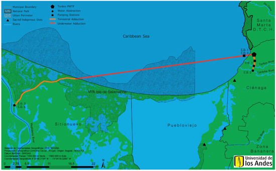 Santa Marta is located in the Magdalena region in the northern coast of Colombia; it is currently experiencing serious problems regarding its water supply. In an average season, the inhabitants require 2.21 m3/s of water; however, the water supply is approximately 1.55 m3/s, that is, nearly 30% less of the required water supply. During the dry season, the supply can be as low as 0.88 m3/s, which represents an approximately 60% shortage [57]. This scarcity has prompted the local water service provider to implement temporary solutions, including the distribution of drinking water via tanker trucks. Problems such as watershed deterioration—and its associated river flow reduction—decreased rainfall, illegal water collection, and rapid demographic growth contribute to this shortage.
